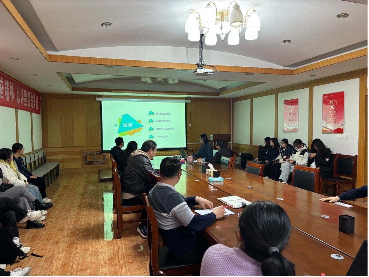 分享会上,胡雨梦重点阐述了教学研究的核心实践路径,包括选题的来源与基本方向,研究设计的类型与规范要点,论文撰写的“雨伞”结构及方法、学理、创新三大意识,还介绍了AI工具在各科研环节的实用功能,为学院教师提供了体系化、可操作的教学研究思路,助力提升科研选题精准度、研究设计规范性及成果转化效率。