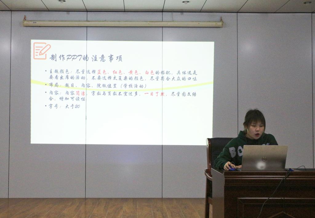此次培训内容分为Word、Excel、PPT、策划案等五个部分。学生委员会办公室副主任刘云圣对Word基本操作做了详细解说和演示,副主任张子璇展示了Excel的基本工具及其操作流程,接着由副主任吴琼做了PPT制作指导,副主任赵子萱带来策划书知识的讲解。