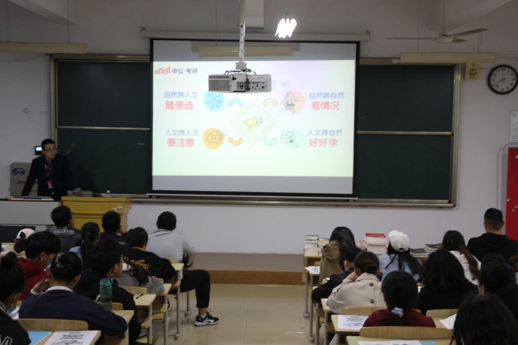 10月16日晚,我院学生会在师专校区第一教学楼108教室组织举办“考研经验交流讲座”。本次讲座由中公考研刘老师主持,我院各专业有考研意向的同学积极参加。