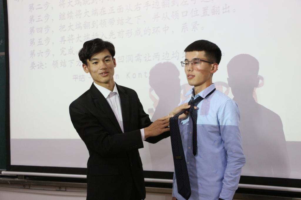首先时晓馨老师以她的亲身经历为同学们阐释了礼仪的规范性和学习礼仪的重要性。随后,女生部的四位主讲人高菡、韩增睿、常文欣和胡传运,具体讲解和亲身演示了不同情景下的礼仪要求及行为规范。在讲解过程中,主讲人细心讲解个人礼仪、社交礼仪、餐桌礼仪等礼仪规范的同时,还积极与台下互动,邀请同学上台体验仪态礼仪——微笑,服装礼仪——男士领带打法。