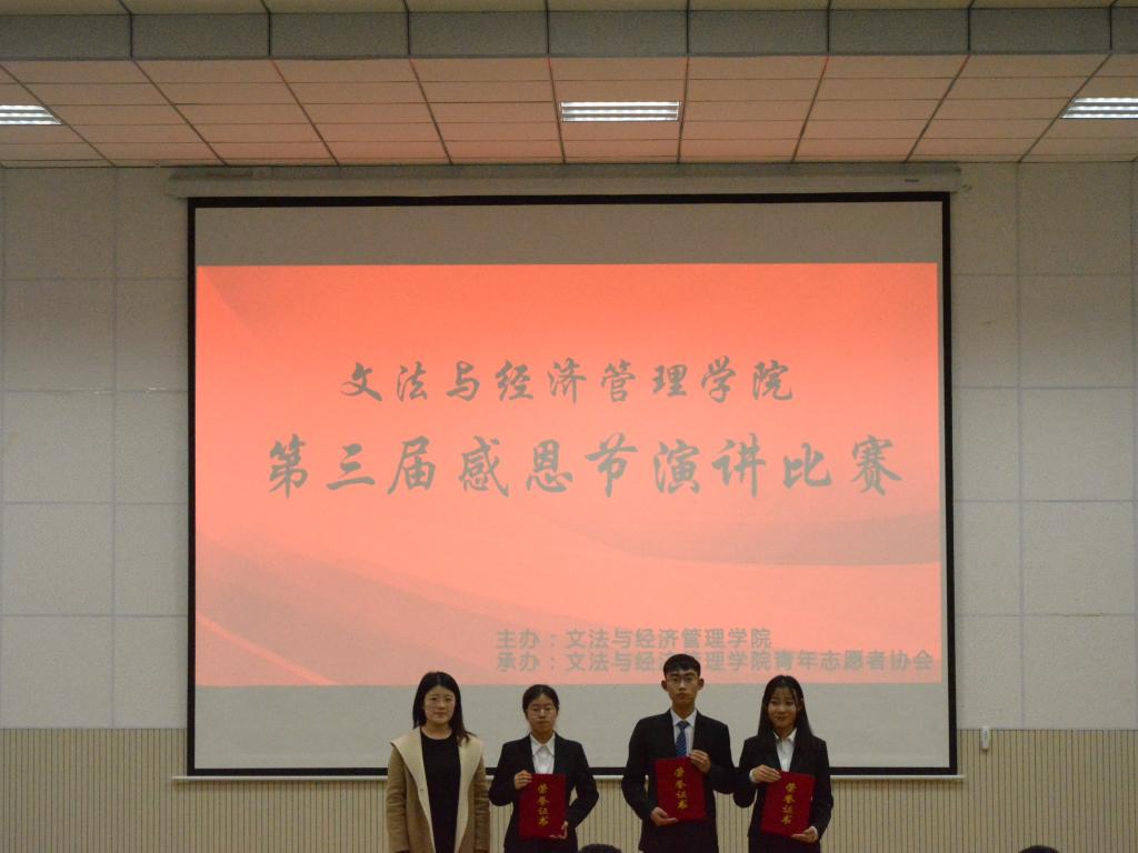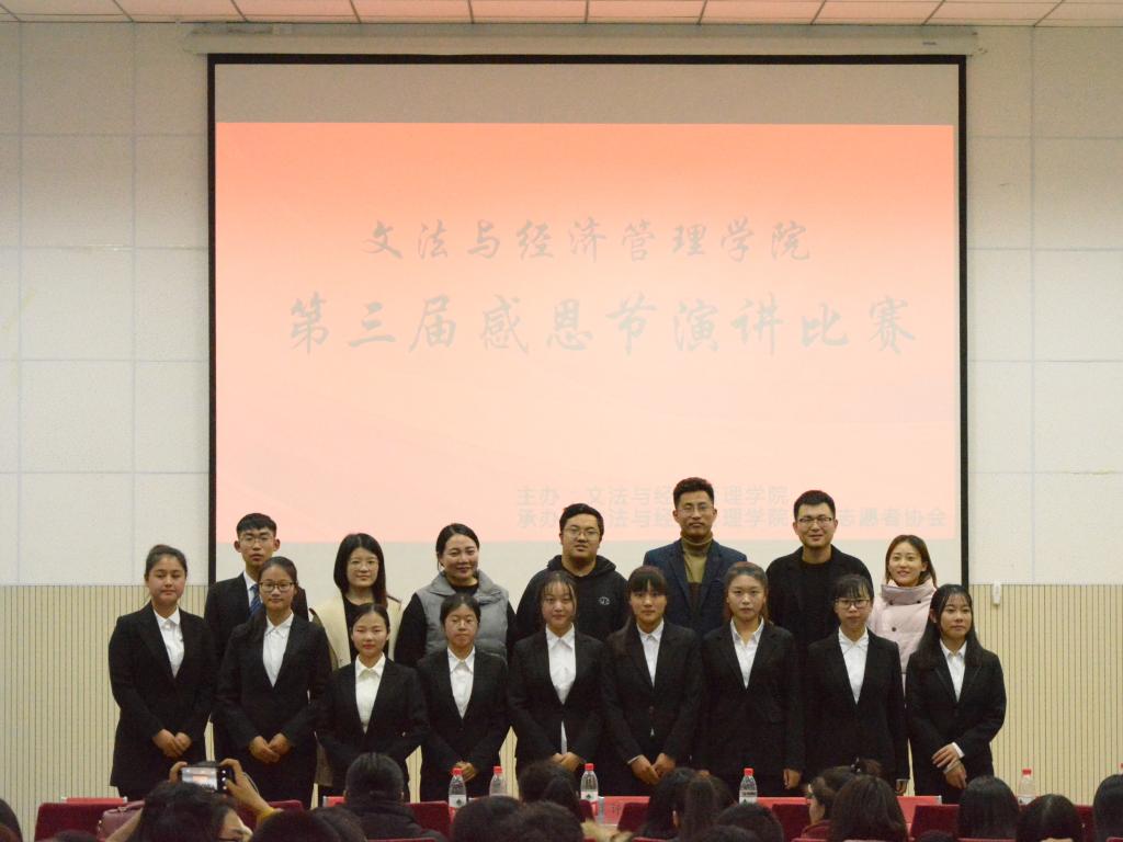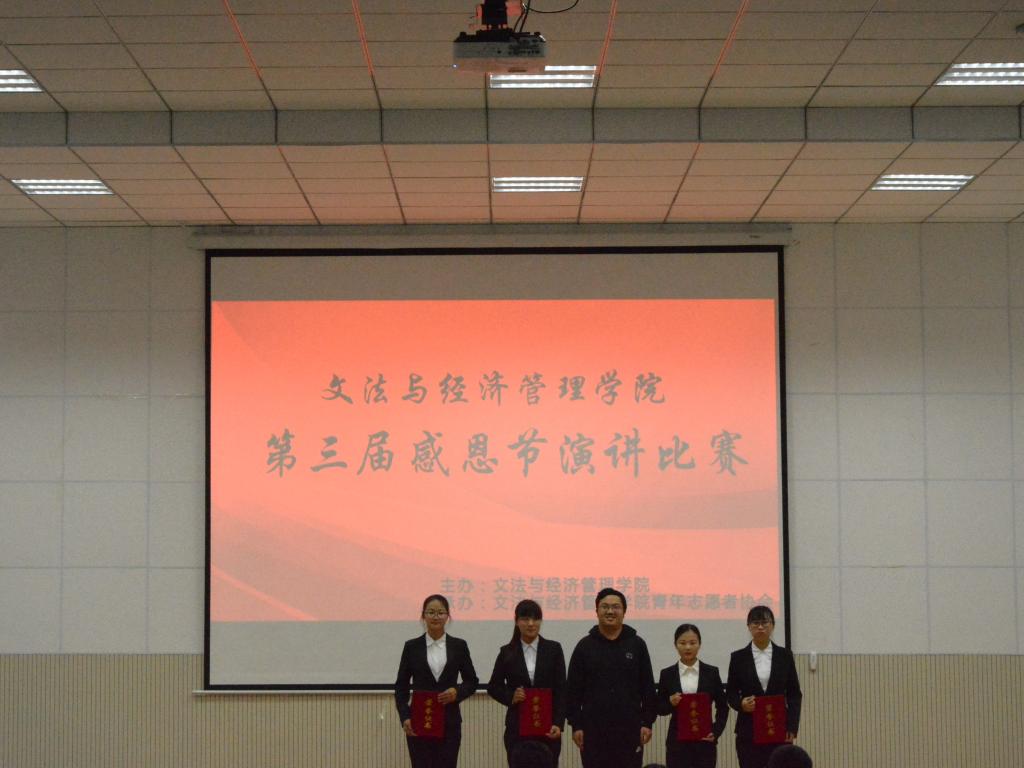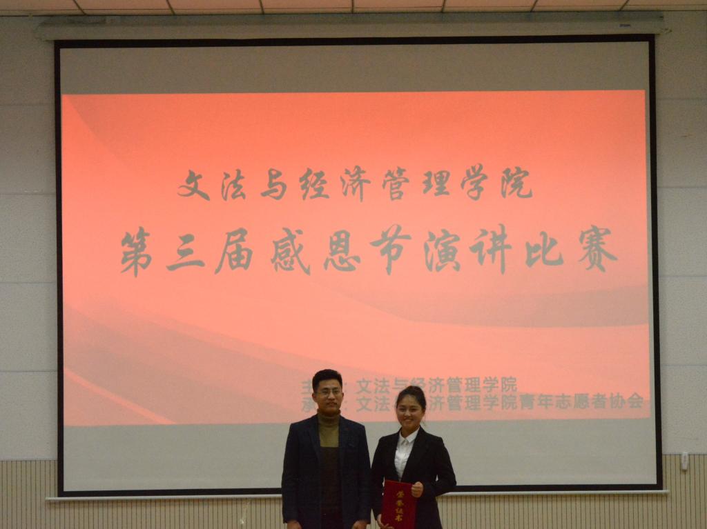 11月22日晚,我院主办、青年志愿者协会承办的“第三届感恩节演讲比赛”在师专校区南电教举行。莅临本场比赛的嘉宾有化学工程学院学工办主任张成明、基础科学学院团总支书记孙志超、我院学工办主任仝世涛、中文系老师侯丽敏以及各专业辅导员老师。王菲、张树真主持本次比赛。