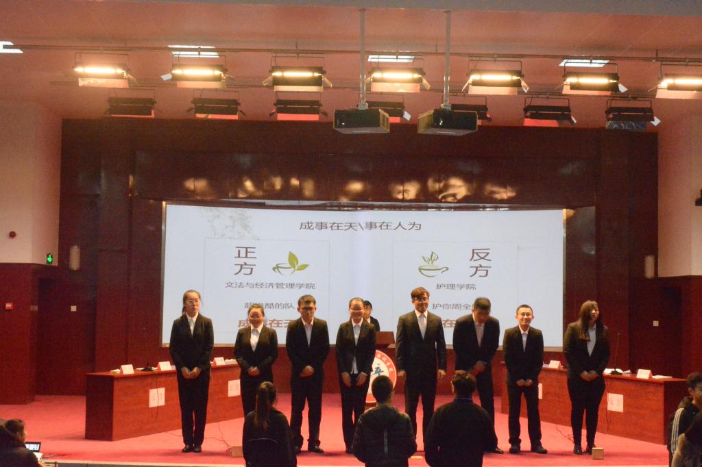 比赛的烽火由正方文法与经济管理学院和反方护理学院点燃,继正、反方的自我介绍后,比赛进入开篇立论环节,正反双方围绕本队所阐述的论题展开激烈的论辩。正方以通俗幽默的语言对“成事在天”的观点进行陈述,反方则一步步进行剖析,论证其“事在人为”的观点。