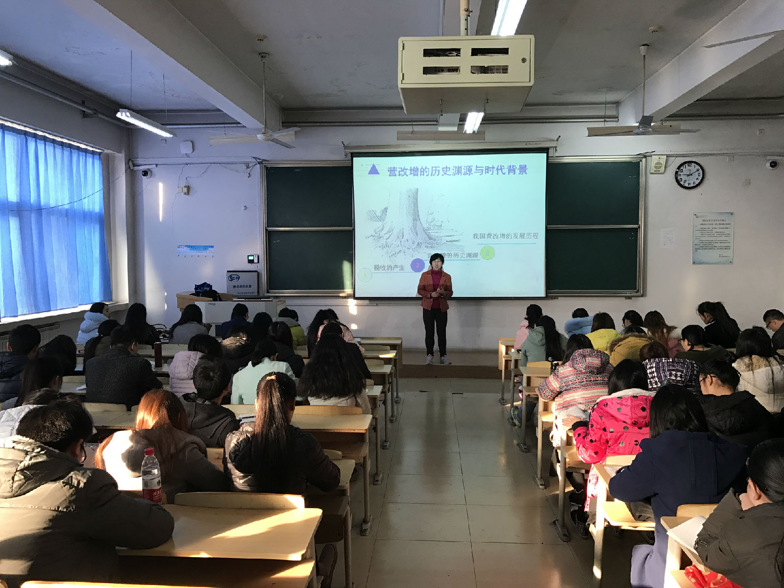 本次学术报告会由经管系贺秀英老师主持,经管系专任教师温丽萍副教授担任主讲。温教授从实际生活出发,将学术论点与财务教学相结合,从“税收的产生、营改增的历史渊源、我国营改增的发展历程”三方面进行讲解。温教授生动、细致的讲解使得整场讲座精彩绝伦。经管系的老师和学生们积极参与现场互动,气氛热烈融洽。