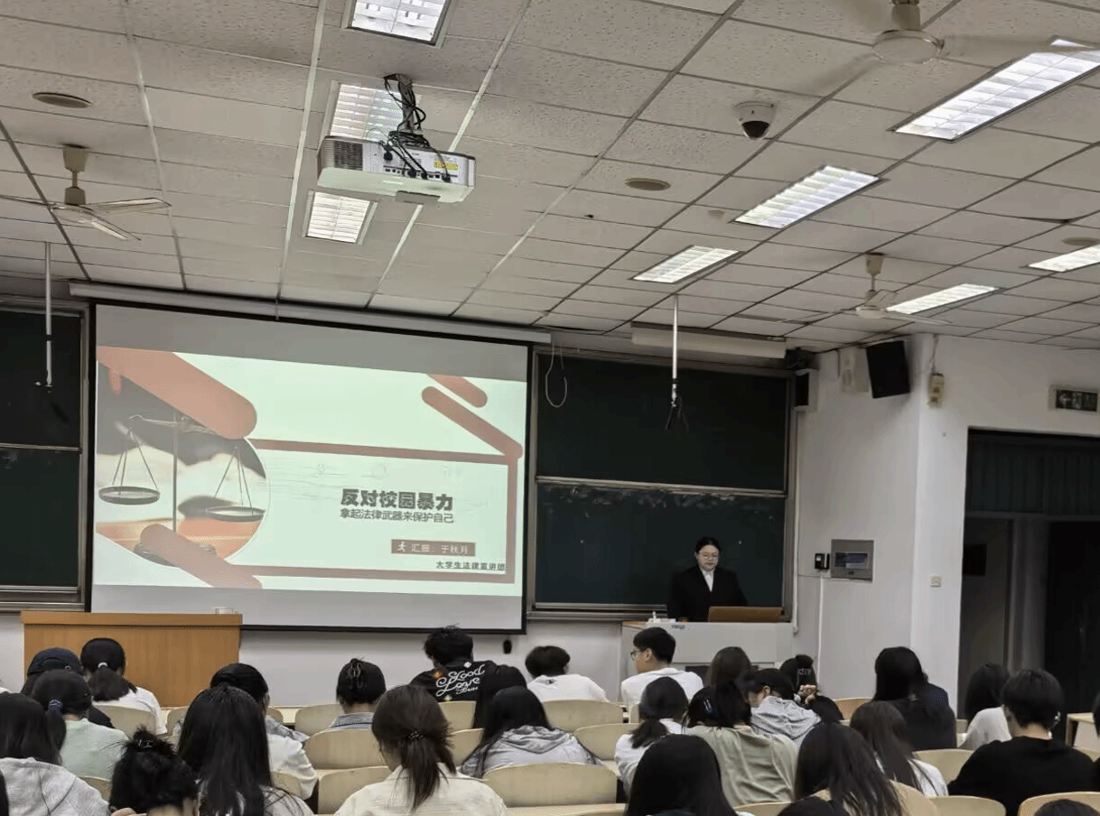 于秋月首先结合真实案例,向同学们剖析了校园暴力的多种表现形式与严重危害,介绍了与校园安全、未成年人网络保护相关的法律条文,加深了同学们在相关方面的法律认知,并针对如何防范校园暴力为同学们提出了有效的建议。